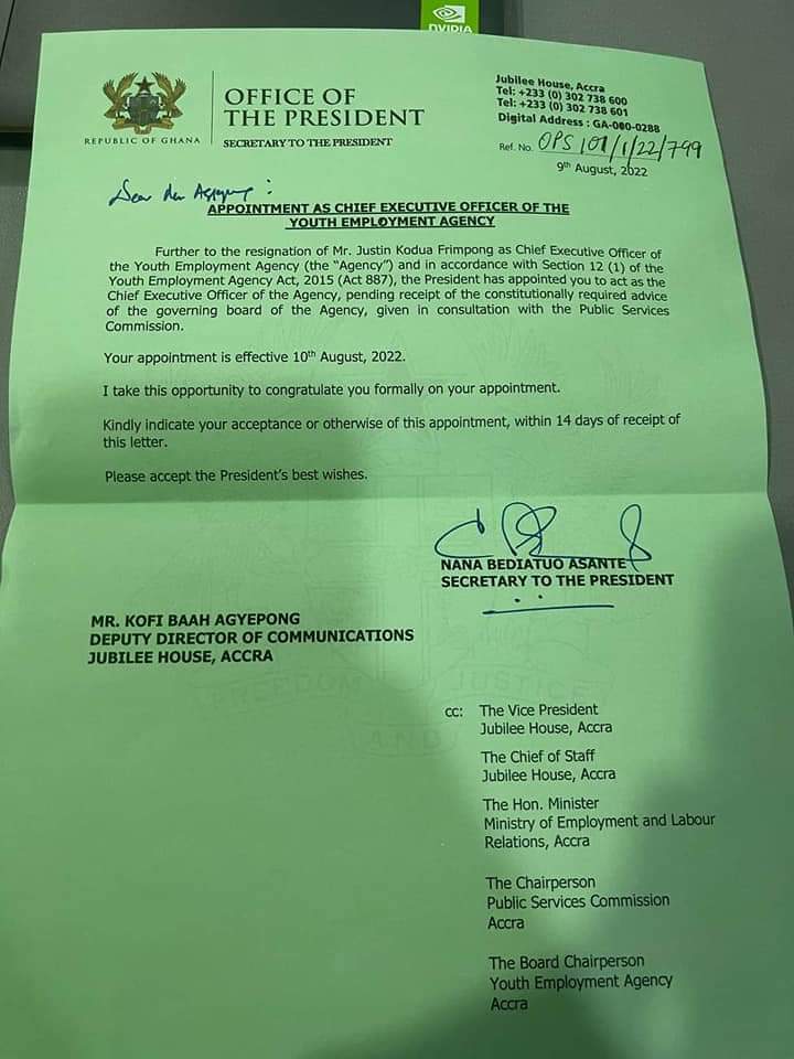 “Further to the resignation of Justin Kodua Frimpong as the Chief Executive Officer of the Youth Employment Agency and in accordance with Section 12(1) of the Youth Employment Agency Act, 2015 (Act 887), the President has appointed you to act as Chief Executive Officer of the Agency, pending receipt of the constitutionally required advice of the governing board of the Agency, given in consultation with the Public Services Commission,” the appointment letter read.